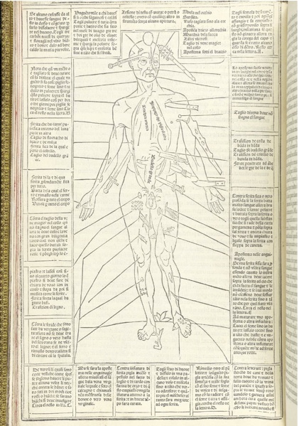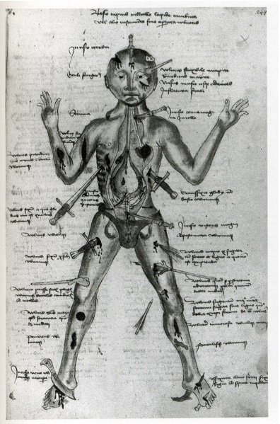 Medicine in medieval Europe was no joke. Anesthesia, sanitation, antibiotics, and plain old soap were yet to be invented, and folks were no strangers to gruesome calamity. Knowledge of anatomy was scarce, experiential, and inaccurate. Medical texts were expensive to reproduce. In the case of treating an acute wound, you had to move quickly. Doctors needed a compact guide for a whole variety of wounds. And so emerged this very clever tool of medical texts.